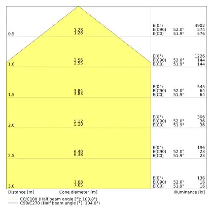 Der Abstrahlwinkel bezeichnet den Winkel, in dem das Licht aus der Lichtquelle ausgestrahlt wird. Er wird in Grad (D) angegeben. Je geringer die Gradzahl des Abstrahlwinkels ist, desto kleiner ist auch der Durchmesser des Lichtkegels, den die Lichtquelle produziert. Beispiel: Wird eine Lampe mit einem Abstrahlwinkel von 60 Grad an der Decke (2,5 m Höhe) angebracht, erzeugt sie einen Lichtkegel von 2,9 Metern Durchmesser. Hat die Lampe hingegen einen Abstrahlwinkel von 120 Grad, beträgt der Lichtkegel 8,7 Meter im Durchmesser. |