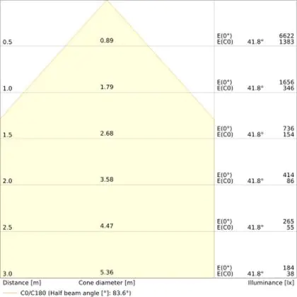 Der Abstrahlwinkel bezeichnet den Winkel, in dem das Licht aus der Lichtquelle ausgestrahlt wird. Er wird in Grad (D) angegeben. Je geringer die Gradzahl des Abstrahlwinkels ist, desto kleiner ist auch der Durchmesser des Lichtkegels, den die Lichtquelle produziert. Beispiel: Wird eine Lampe mit einem Abstrahlwinkel von 60 Grad an der Decke (2,5 m Höhe) angebracht, erzeugt sie einen Lichtkegel von 2,9 Metern Durchmesser. Hat die Lampe hingegen einen Abstrahlwinkel von 120 Grad, beträgt der Lichtkegel 8,7 Meter im Durchmesser. |