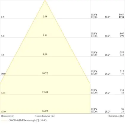 Der Abstrahlwinkel bezeichnet den Winkel, in dem das Licht aus der Lichtquelle ausgestrahlt wird. Er wird in Grad (D) angegeben. Je geringer die Gradzahl des Abstrahlwinkels ist, desto kleiner ist auch der Durchmesser des Lichtkegels, den die Lichtquelle produziert. Beispiel: Wird eine Lampe mit einem Abstrahlwinkel von 60 Grad an der Decke (2,5 m Höhe) angebracht, erzeugt sie einen Lichtkegel von 2,9 Metern Durchmesser. Hat die Lampe hingegen einen Abstrahlwinkel von 120 Grad, beträgt der Lichtkegel 8,7 Meter im Durchmesser. |