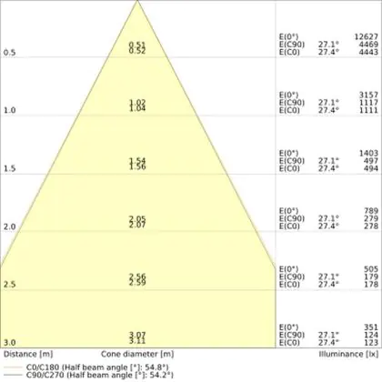 Der Abstrahlwinkel bezeichnet den Winkel, in dem das Licht aus der Lichtquelle ausgestrahlt wird. Er wird in Grad (D) angegeben. Je geringer die Gradzahl des Abstrahlwinkels ist, desto kleiner ist auch der Durchmesser des Lichtkegels, den die Lichtquelle produziert. Beispiel: Wird eine Lampe mit einem Abstrahlwinkel von 60 Grad an der Decke (2,5 m Höhe) angebracht, erzeugt sie einen Lichtkegel von 2,9 Metern Durchmesser. Hat die Lampe hingegen einen Abstrahlwinkel von 120 Grad, beträgt der Lichtkegel 8,7 Meter im Durchmesser. |