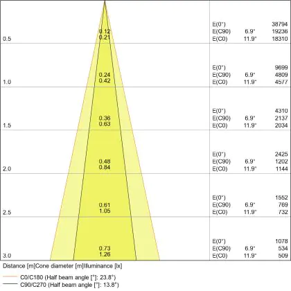 Der Abstrahlwinkel bezeichnet den Winkel, in dem das Licht aus der Lichtquelle ausgestrahlt wird. Er wird in Grad (D) angegeben. Je geringer die Gradzahl des Abstrahlwinkels ist, desto kleiner ist auch der Durchmesser des Lichtkegels, den die Lichtquelle produziert. Beispiel: Wird eine Lampe mit einem Abstrahlwinkel von 60 Grad an der Decke (2,5 m Höhe) angebracht, erzeugt sie einen Lichtkegel von 2,9 Metern Durchmesser. Hat die Lampe hingegen einen Abstrahlwinkel von 120 Grad, beträgt der Lichtkegel 8,7 Meter im Durchmesser. |