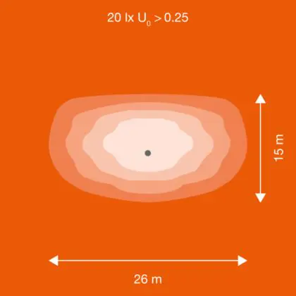 Der Abstrahlwinkel bezeichnet den Winkel, in dem das Licht aus der Lichtquelle ausgestrahlt wird. Er wird in Grad (D) angegeben. Je geringer die Gradzahl des Abstrahlwinkels ist, desto kleiner ist auch der Durchmesser des Lichtkegels, den die Lichtquelle produziert. Beispiel: Wird eine Lampe mit einem Abstrahlwinkel von 60 Grad an der Decke (2,5 m Höhe) angebracht, erzeugt sie einen Lichtkegel von 2,9 Metern Durchmesser. Hat die Lampe hingegen einen Abstrahlwinkel von 120 Grad, beträgt der Lichtkegel 8,7 Meter im Durchmesser. |