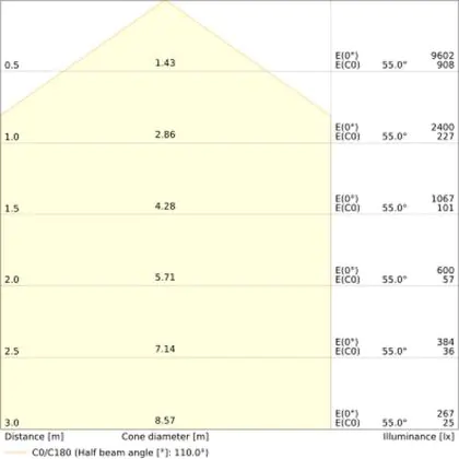 Der Abstrahlwinkel bezeichnet den Winkel, in dem das Licht aus der Lichtquelle ausgestrahlt wird. Er wird in Grad (D) angegeben. Je geringer die Gradzahl des Abstrahlwinkels ist, desto kleiner ist auch der Durchmesser des Lichtkegels, den die Lichtquelle produziert. Beispiel: Wird eine Lampe mit einem Abstrahlwinkel von 60 Grad an der Decke (2,5 m Höhe) angebracht, erzeugt sie einen Lichtkegel von 2,9 Metern Durchmesser. Hat die Lampe hingegen einen Abstrahlwinkel von 120 Grad, beträgt der Lichtkegel 8,7 Meter im Durchmesser. |