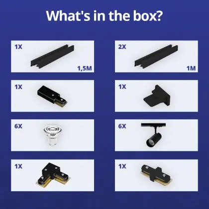 Description Bright Choice Ensemble complet Rail Monophasé Rail L 1,5 x 2 Mètre Noir | incl. 6x Spot + GU10 2700K 3W Dimmable + Embout, Connecteur d’Alimentation et L -Connecteur