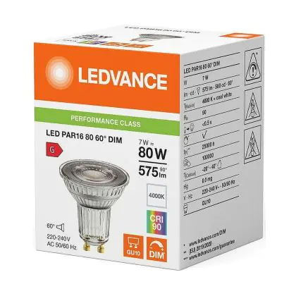 Cette ampoule Lot 10x Ledvance LED PAR16 GU10 Réflecteur 7W 575lm 60D - 940 Blanc Froid | Meilleur Rendu De Couleur - Dimmable - Remplacement 80W est le produit de remplacement idéal pour votre ancienne ampoule avec un culot GU10. Grâce à la technologie LED intégrée, vous pourrez faire des économies d’énergie substantielles. Ce spot Lot 10x Ledvance LED PAR16 GU10 Réflecteur 7W 575lm 60D - 940 Blanc Froid | Meilleur Rendu De Couleur - Dimmable - Remplacement 80W avec son efficacité lumineuse de lumen par watt, vous permettra de profiter d’un éclairage de qualité en toute circonstance.